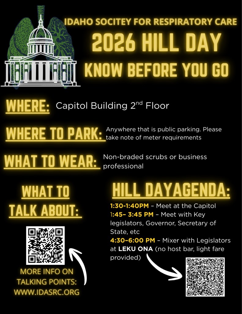 The goal for this Hill Day is to meet with members of the Idaho Legislators, share powerful stories from clinical practice and education, and the future of respiratory care. As the demands placed on respiratory therapists continue to grow, from managing chronic respiratory disease to responding to public health emergencies, our presence on Capitol Hill ensures that state leaders understand the critical role RTs play in every corner of healthcare.
